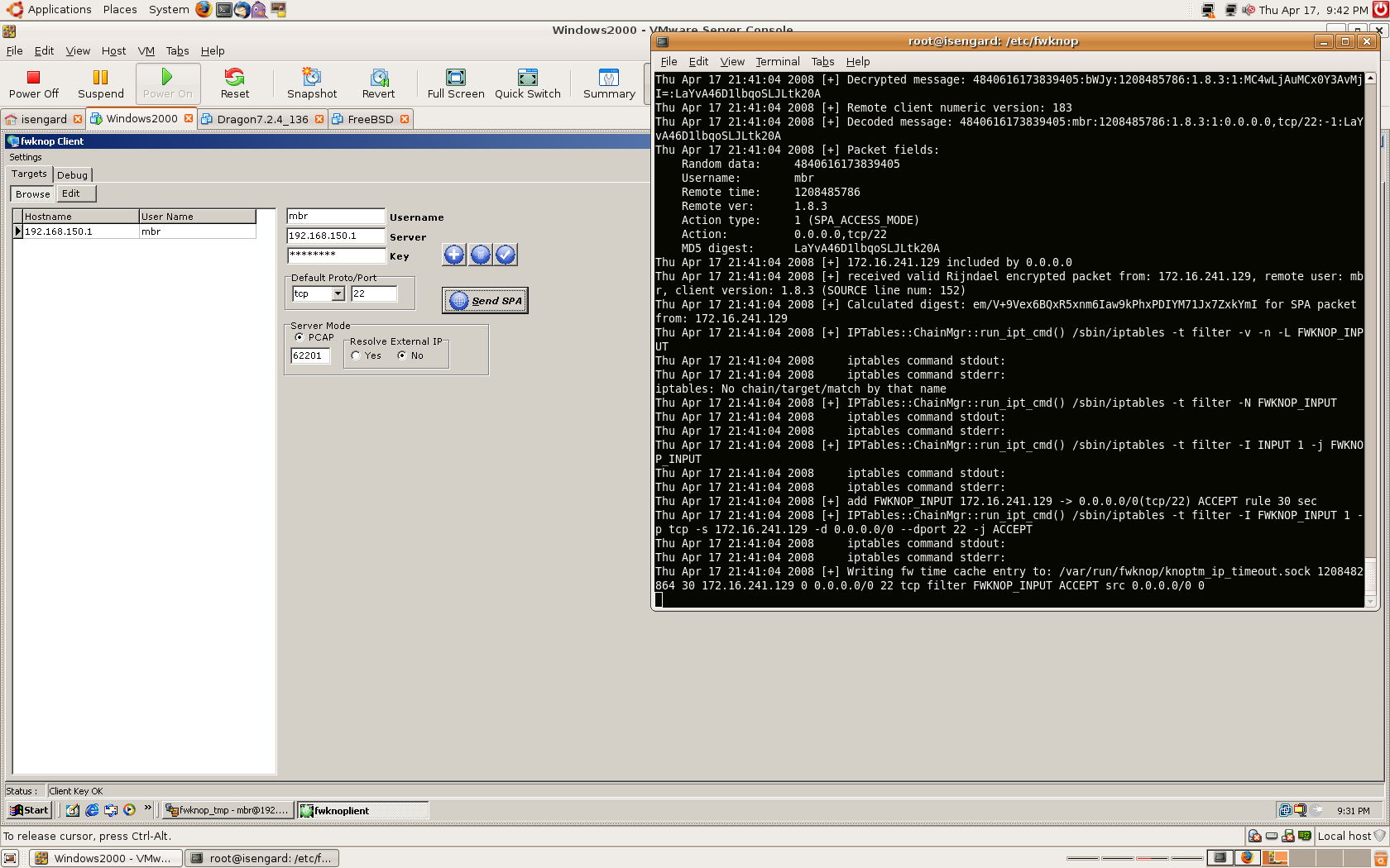 Sean Greven has released the next version of his fwknop UI for Windows systems. This release is compatible with all fwknop daemons that are configured to accept SPA packets that have been encrypted with the Rijndael symmetric cipher. The executable can be downloaded here, and the source code is also available here. Finally, here is a screenshot to illustrate generating an SPA packet from Windows 2000 running under VMware on an Ubuntu 7.10 system. The fwknopd daemon is running in --debug mode in the terminal on the right, and you can see the addition of an iptables ACCEPT rule to allow access to SSHD: